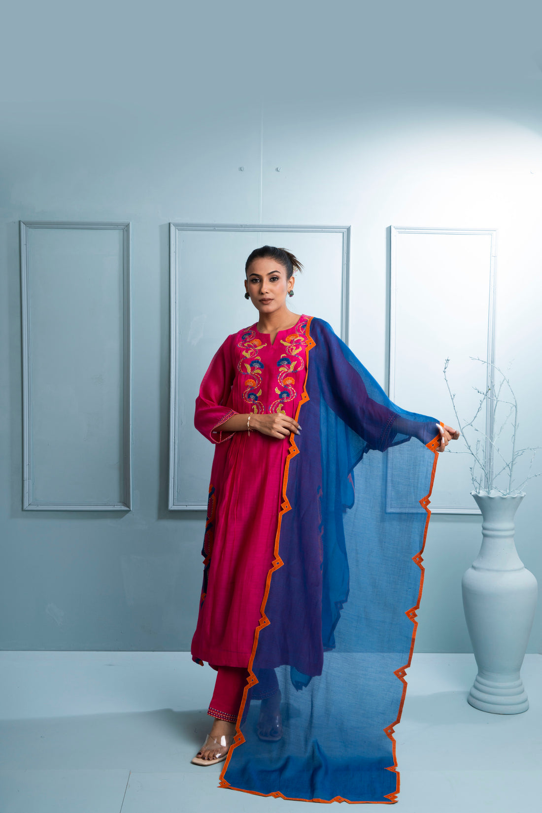 Fuchsia Pink Pleated Mul Chanderi Kurta Set features exquisite applique work on the yoke and...