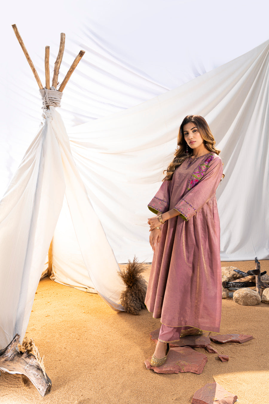Mauve Handloom Cotton Zari Tissue Embroidered Kurta Set