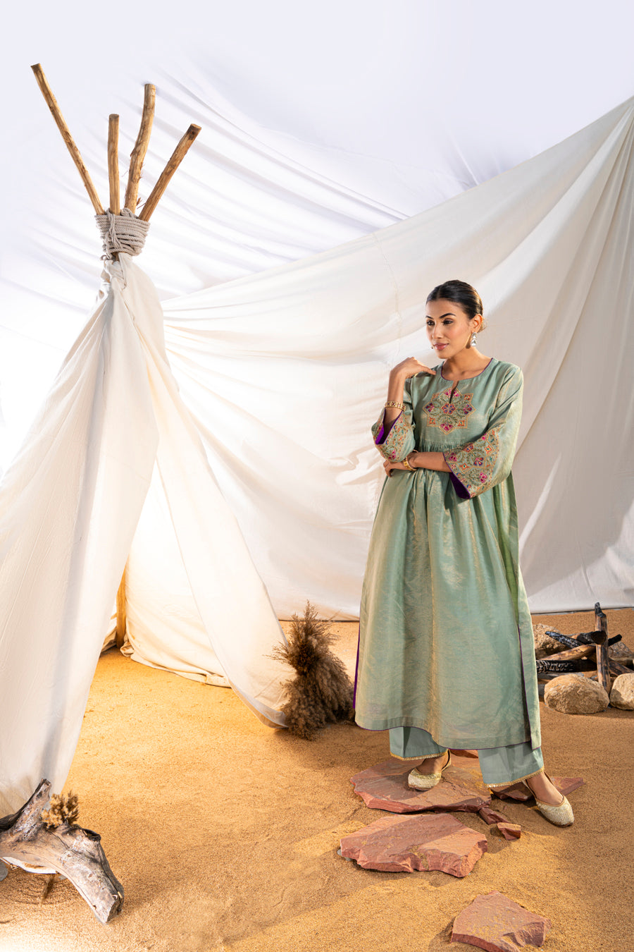 Green Handloom Cotton Zari Tissue Embroidered Kurta Set