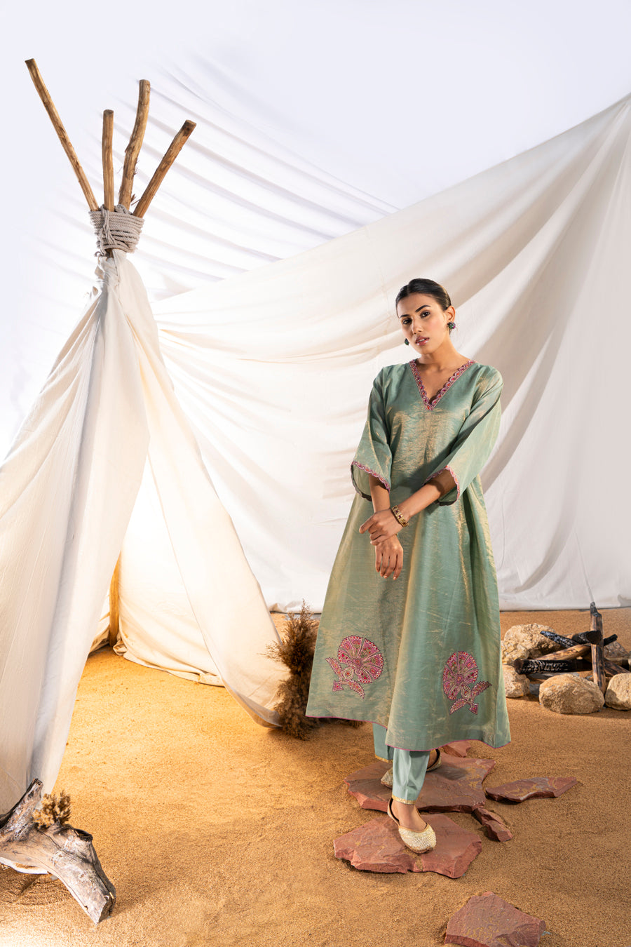 Green handloom cotton zari tissue kurta, designed in an aligadi cut features a V neckline...