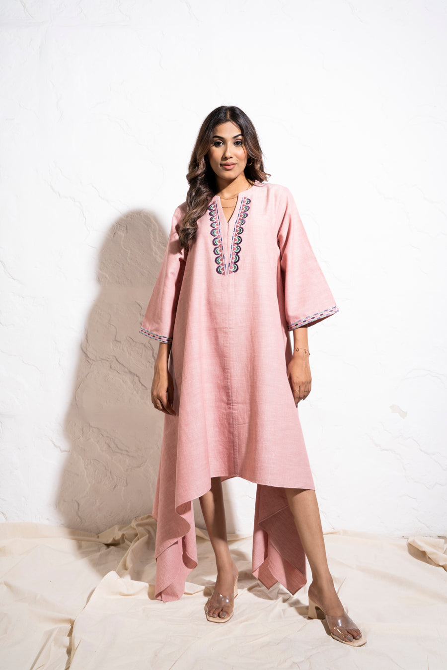 Baby pink asymmetrical dress crafted from soft handwoven cotton fabric with fringed embroidery detailing.