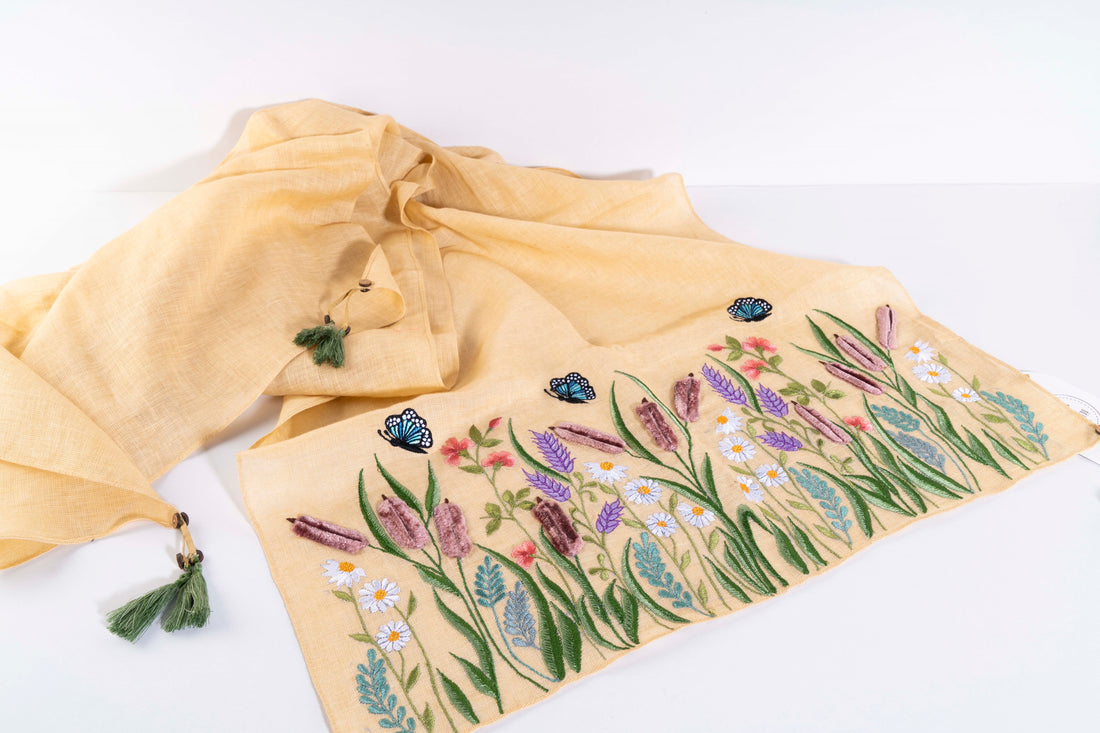 Blooming garden of delicate florals in silk threads on a soft cream base with fluttering...
