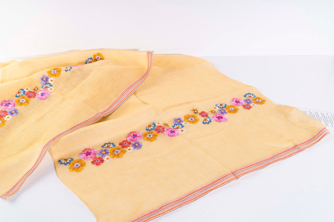 Pristine white linen base with 3d florals done in intricate thread work in hues of...